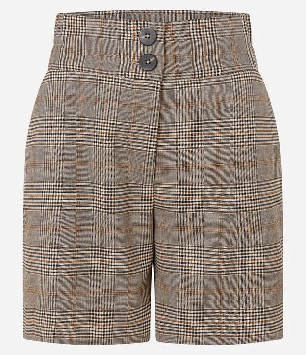 Short feminino de alfaiataria com padronagem xadrez. Possui cós alto, botões frontais aparentes, pernas retas levemente amplas e bolsos embutidos na parte traseira.