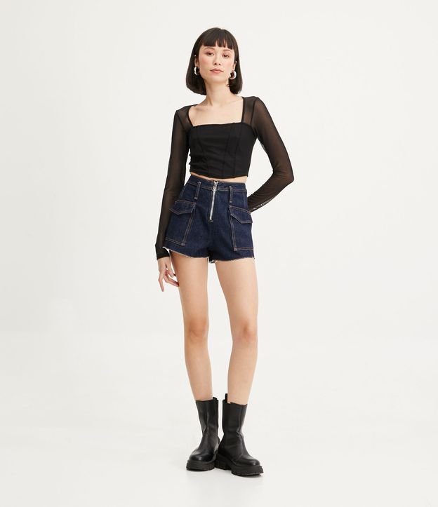 Short Cintura Alta em Jeans com Bolsos e Costura Aparente