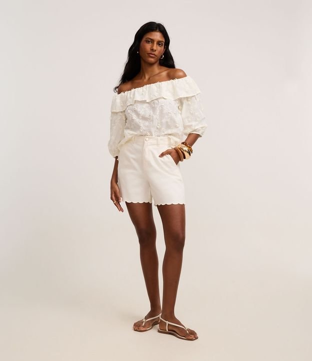 Short Cintura Alta em Sarja com Barra Nuvem Off White