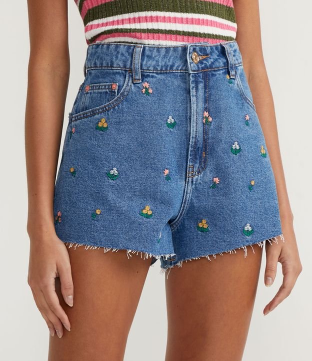 Short Cintura Alta Jeans com Bordados de Florzinhas