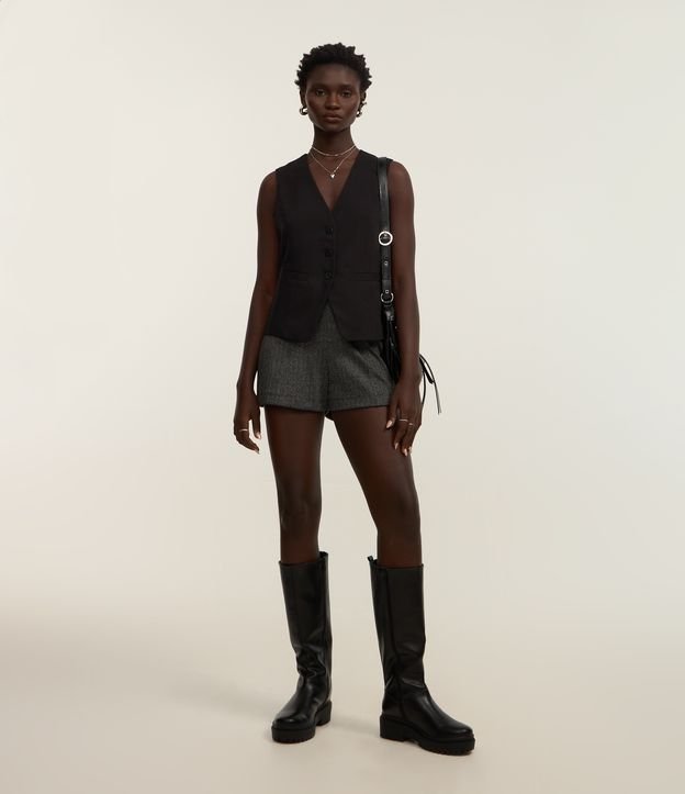 Short Curto em Jacquard Espinha de Peixe com Friso Frontal Cinza