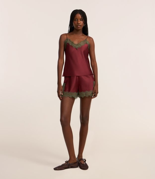 Short Curto Evasê em Cetim Com Renda Contrastante na Barra Vermelho