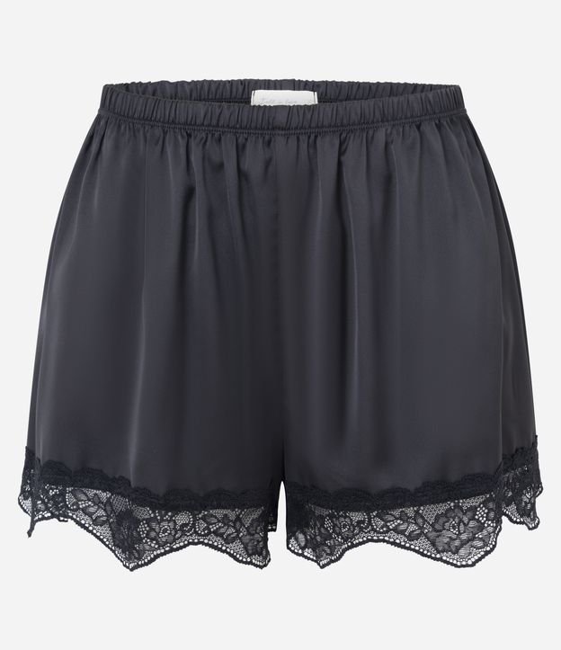 Peça avulsa de pijama feminino. Shortinho de pijama confeccionado em cetim, sem estampa, com cós elástico e detalhe de renda em pontas na barra.