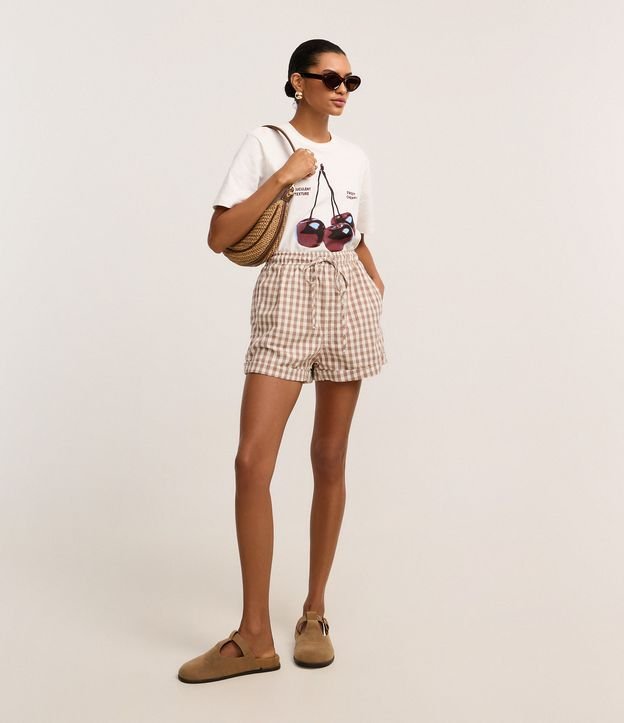 Short confeccionado em sarja, com elástico e amarração no cós, bolso e estampa xadrez vichy.. Este produto possui material mais sustentável em sua composição, sendo ambientalmente mais responsável.