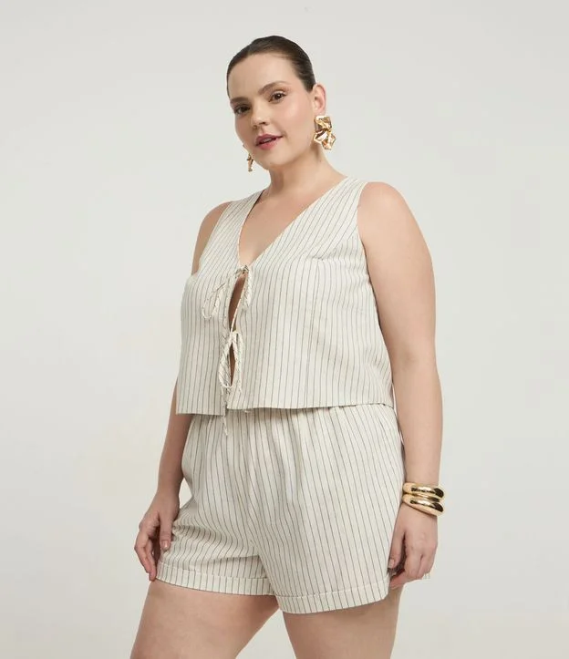 Short em Viscolinho Listrado com Amarração na Cintura e Bolsos Curve & Plus Size Off White