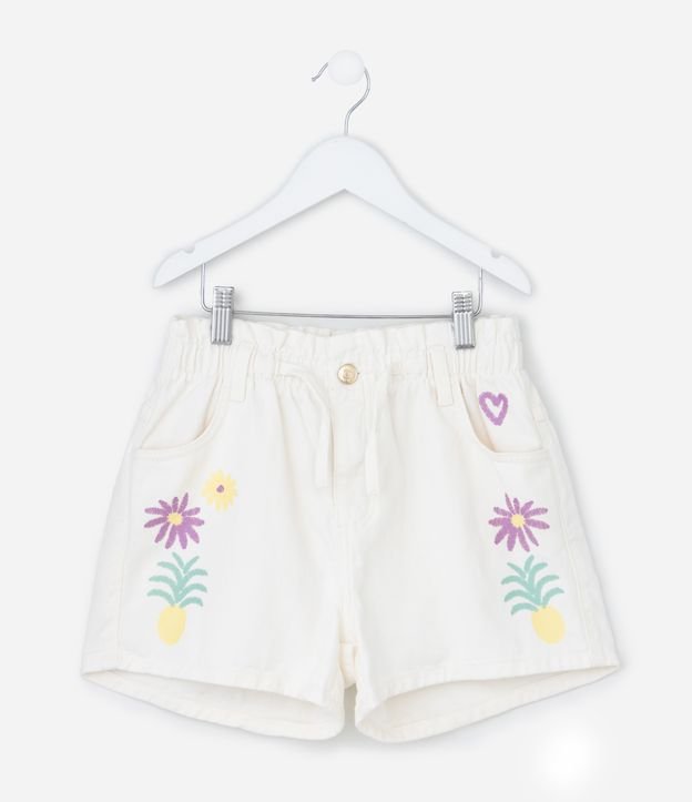 • Short Infantil Clochard em Sarja com Estampa Tropical Bordada - Tam 5 a 14 Anos Branco 1