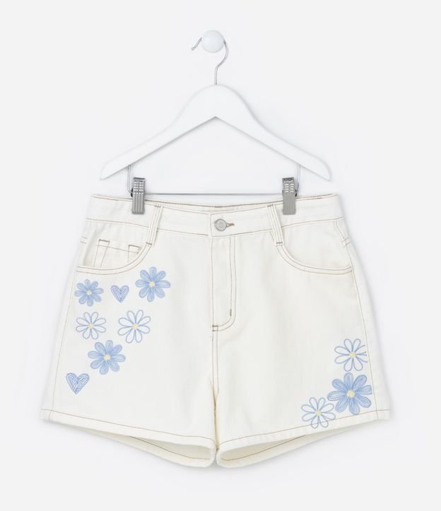 Short Infantil em Sarja com Bordado de Flores - Tam 5 a 14 Anos Off White