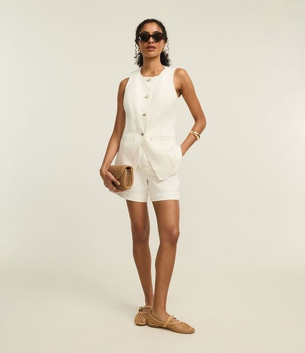 Short Mom Alfaiataria em Sarja com Botão Forrado e Costuras Contrastantes Branco