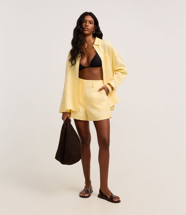 Short Reto Cintura Alta em Linho com Pences e Bolsos Amarelo