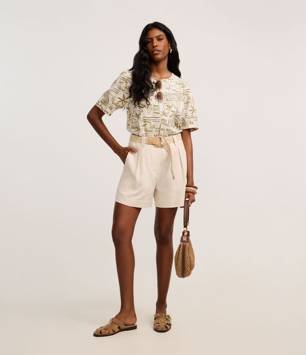 Short reto de cintura alta, confeccionado em viscolinho, com passantes na cintura, pregas e fechamento tradicional. Inclui cinto de ráfia artificial com fivelas de argolas. Este produto possui viscose certificada em sua composição, sendo ambientalmente mais responsável.