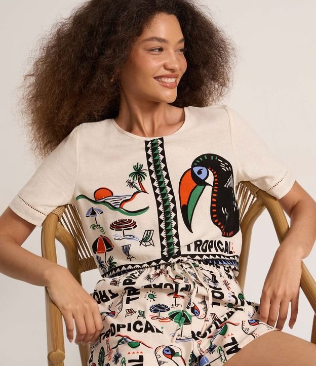 Short Runner Cintura Alta em Viscolinho com Estampa Tropical Bege