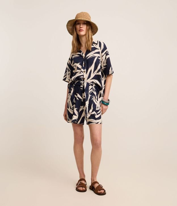 Short Runner em Viscolinho com Amarração e Estampa Folhagem Azul Marinho/Off White