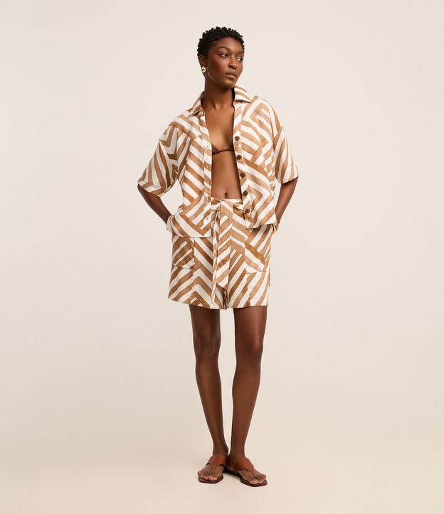Short Runner em Viscolinho com Amarração e Estampa Geométrica Caramelo/Bege