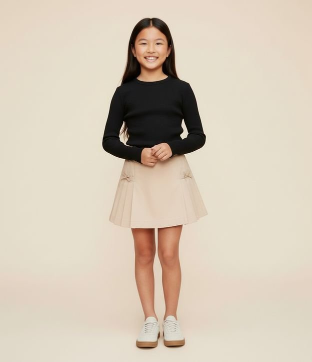 • Short Saia Infantil em Sarja com Pregas e Lacinho - Tam 5 a 16 anos Bege 1
