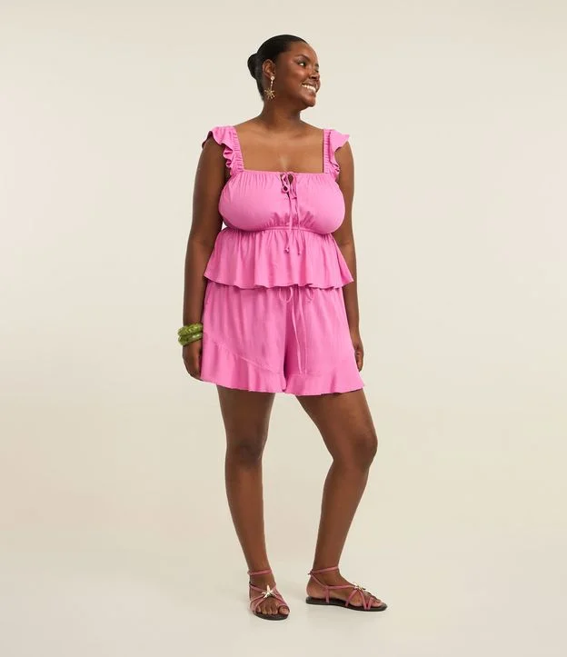 Short plus size confeccionado em viscose chalis, soltinho, com cós elástico e amarração na cintura. Sem estampa, possui babadinho na barra.