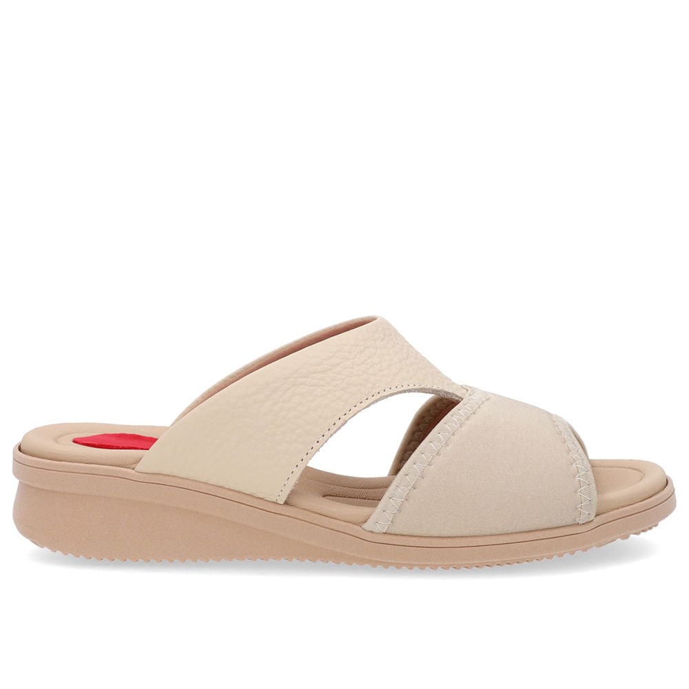 Tamanco cabedal em tecido elástano e couro relax catalano na cor vanilla. O modelo possui tecnologia Joanetes, que alivia o desconforto da região, garantindo suavidade na pisada por usufruir de materiais moldáveis nos pés.