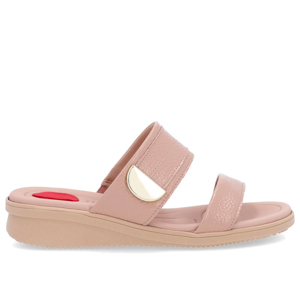 Slide cabedal em tecido elástano e couro verniz show na cor rose duna. O modelo possui tecnologia Menor Impacto, proporcionando amortecimento no calcanhar e na planta do pé, oferecendo conforto principalmente para pessoas com esporão de calcâneo e metatarsalgia.