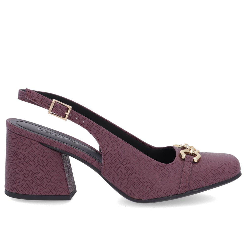 Slingback em couro arraia na cor ameixa. O modelo possui tecnologia Memória Permanente, com material de capacidade de retorno e mantêm o formato dos seus pés na palmilha.