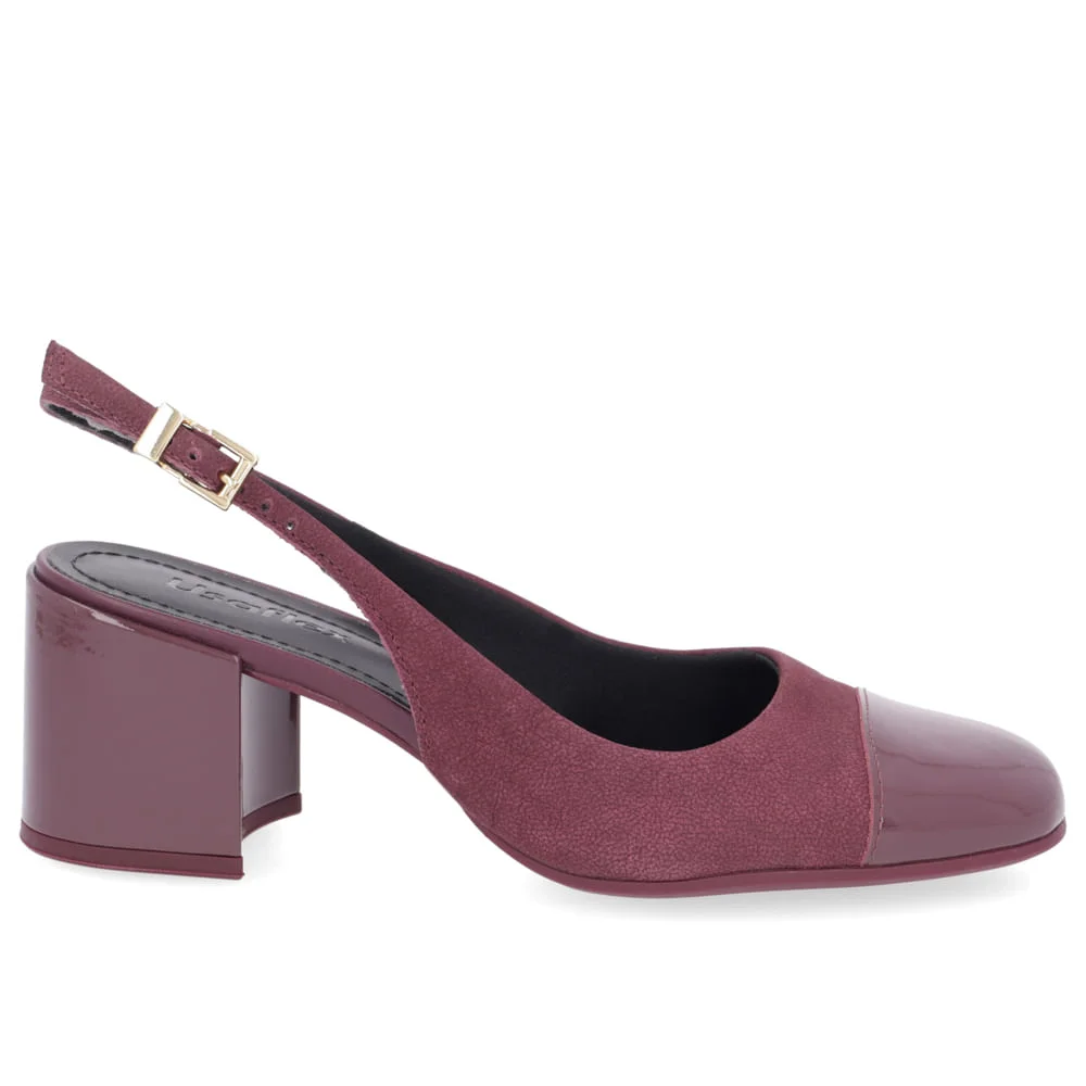 Slingback salto bloco cabedal em couro luxor e camurcinha na cor ameixa fechamento de fivela. O modelo possui tecnologia Memória Permanente, com material de capacidade de retorno e mantêm o formato dos seus pés na palmilha.