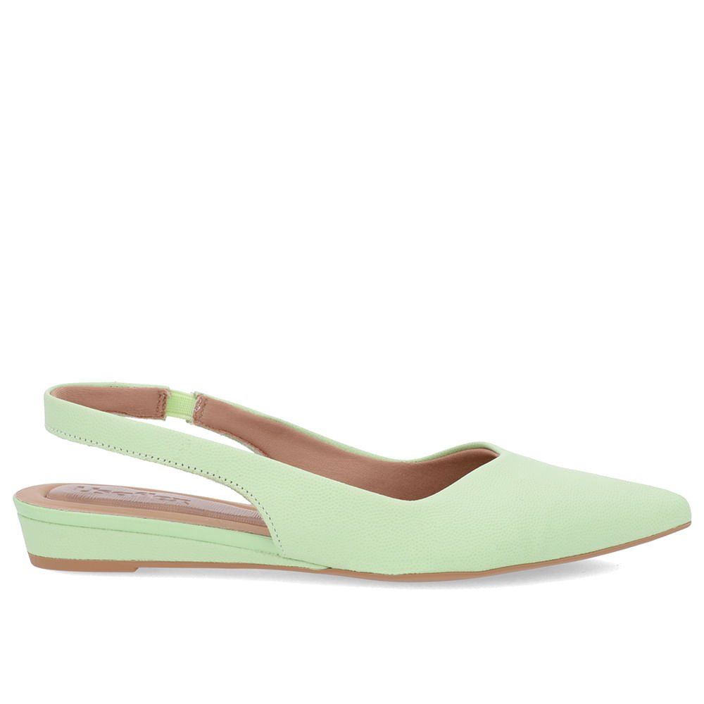 Slingback cabedal em couro arraia na cor verde mentolado. Sistema de amortecimento em gel que se molda ao formato do pé, absorvendo o impacto e gerando uma sensação única de conforto.