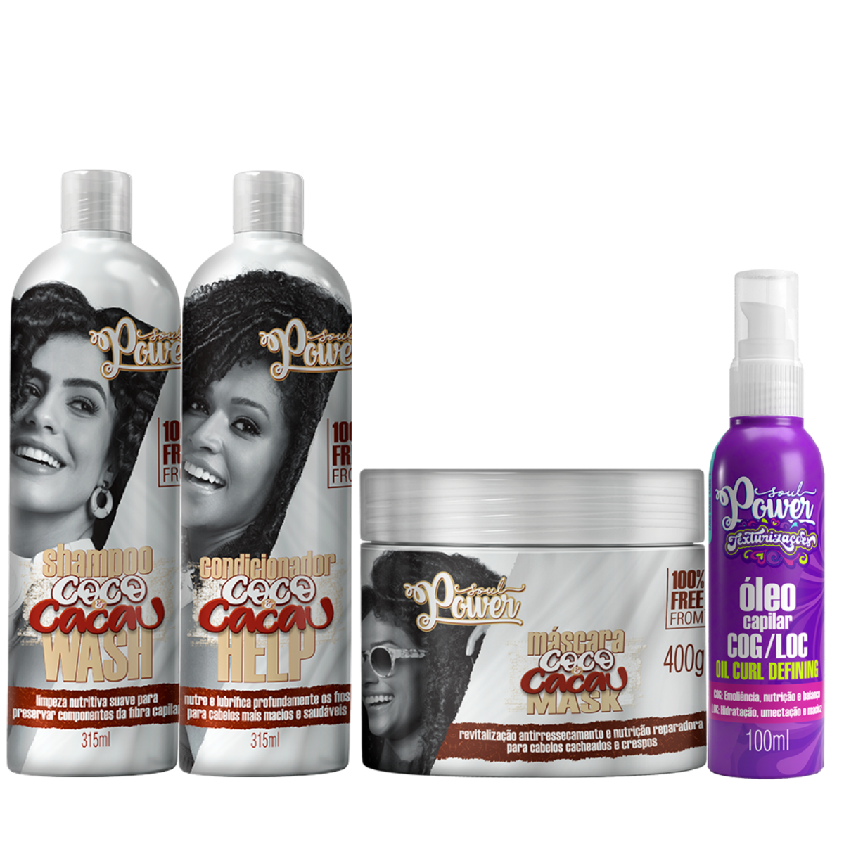 Soul Power Coco e Cacau Wash Shampoo 315ml - 1/nSoul Power Coco e Cacau Condicionador 315ml - 1/nSoul Power Coco e Cacau Mascara 400g - 1/nSoul Power Texturizações Curl Óleo 100ml - 1