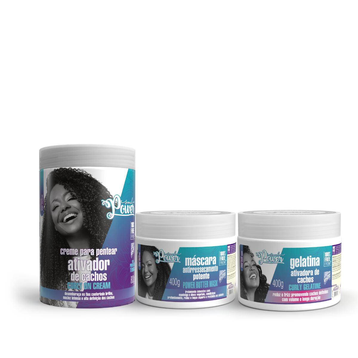 Soul Power Butter Mask Mascara 400g - 1/nSoul Power Curly On Cream Creme para Pentear 800ml - 1/nSoul Power Curly Gelatina Ativadora de Cachos 400ml - 1