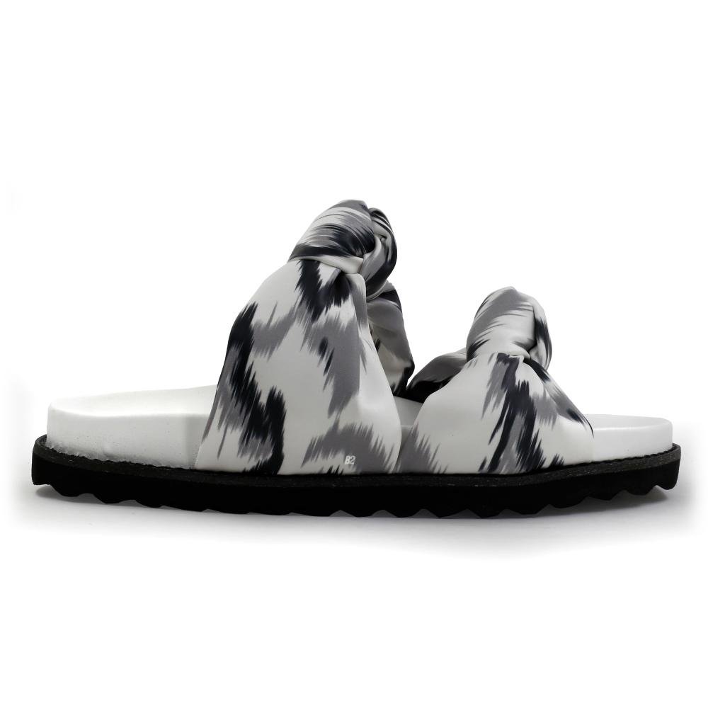 Sandália papete. O modelo tem solado médio, que afina na altura dos dedos, e base tratorada marrom. Traz tiras largas tramadas, com detalhe em nó, sobre os dedos e peito do pé.