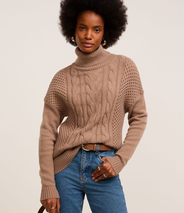 Suéter Amplo em Tricô com Gola Alta e Ponto Diferenciado