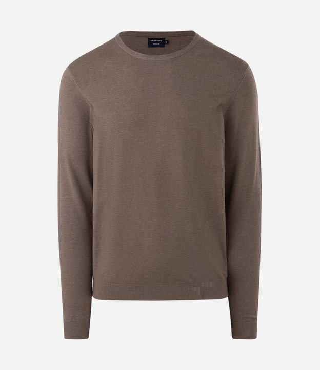 Suéter masculino confeccionado em efeito tricô com processo mais sustentável. Modelo básico com gola redonda, cava levemente deslocada e acabamento canelado em punhos e barra para toque sofisticado.