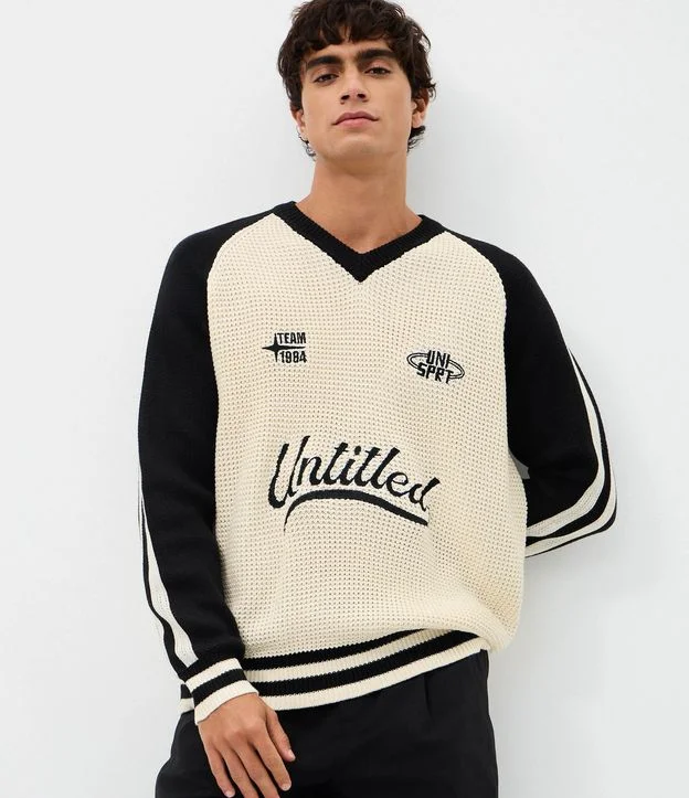 Suéter Boxy em Tricô com Lettering Untitled e Listras nas Mangas e Barra Branco