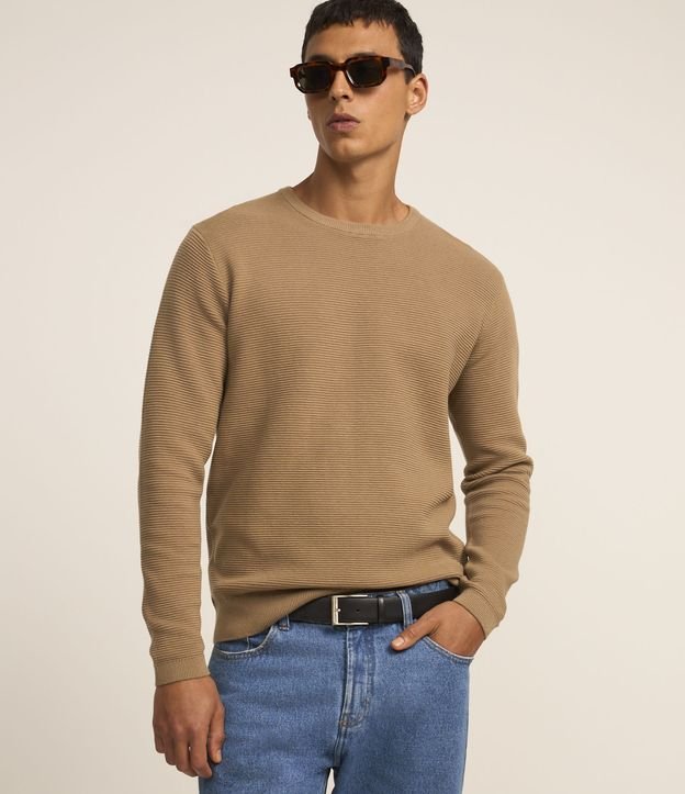 Suéter masculino de modelo comfort, confeccionado em tricô, com textura canelada na horizontal. Possui gola redonda, mangas longas, barra e punhos ajustados.