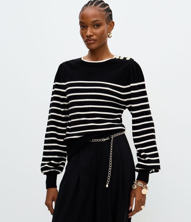 Suéter em Tricô com Estampa Listrada e Botões no Ombro Preto