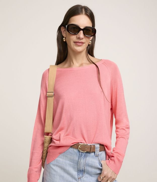 Suéter em tricô, com gola redonda, mangas longas e sem estampa.