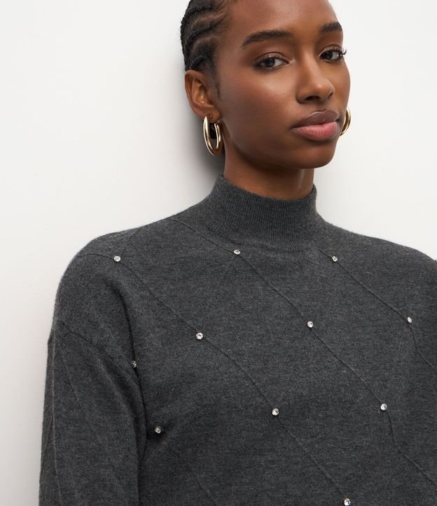 Suéter em Tricô com Golinha Média e Aplicação de Bolinhas Cinza