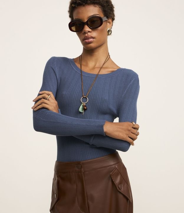 Suéter feminino manga longa, confeccionado em tricô, com textura canelada e gola careca.