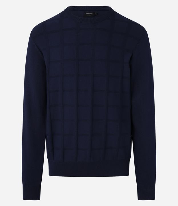 Suéter masculino em tricô, confeccionado em viscose mais sustentável, com gola redonda, mangas longas, textura quadriculada e detalhes canelados.