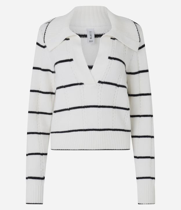 Suéter em Tricô Pesado com Gola Polo e Estampa Listrada Branco