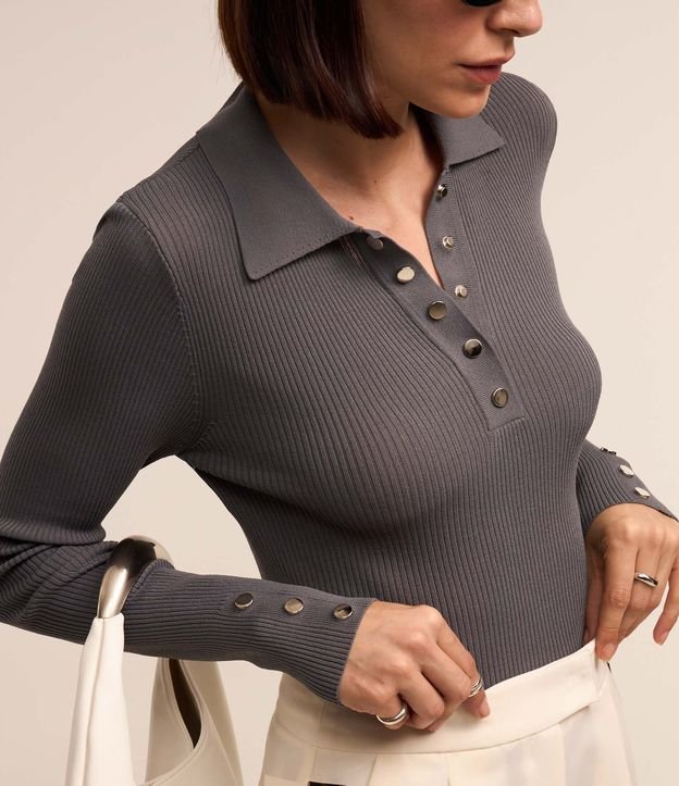 Suéter em Viscose com Gola Lapela e Abotoamento Cinza
