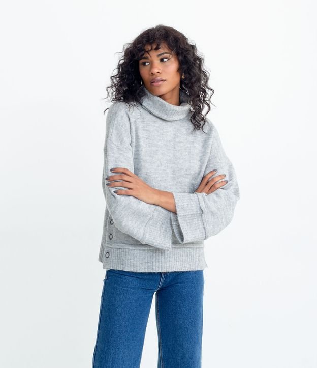 Suéter Gola Alta em Tricô com Mangas Amplas e Botões nas Laterais