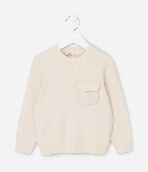 Suéter infantil confeccionado em tricô quentinho, com gola redonda, mangas longas e bolsinho com lapela no peito.