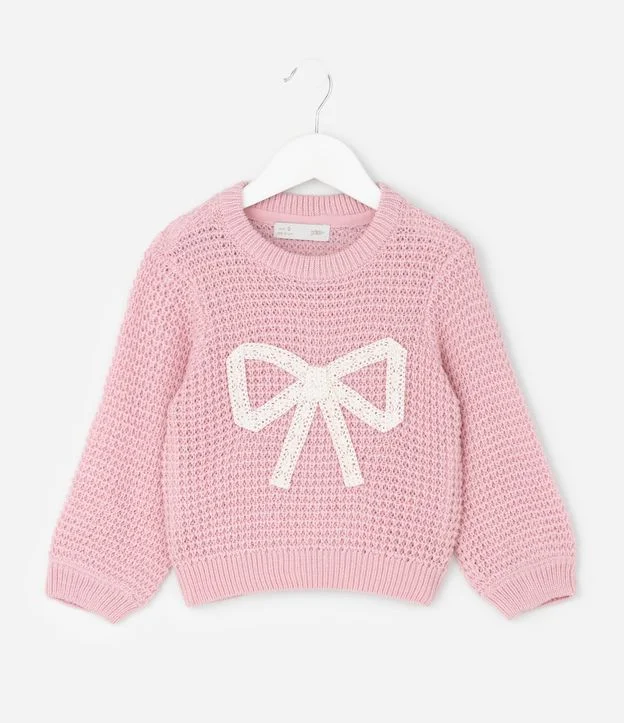 Suéter Infantil em Efeito Tricô com Bordado de Laço – Tam 1 a 5/6 Anos Rosa Claro