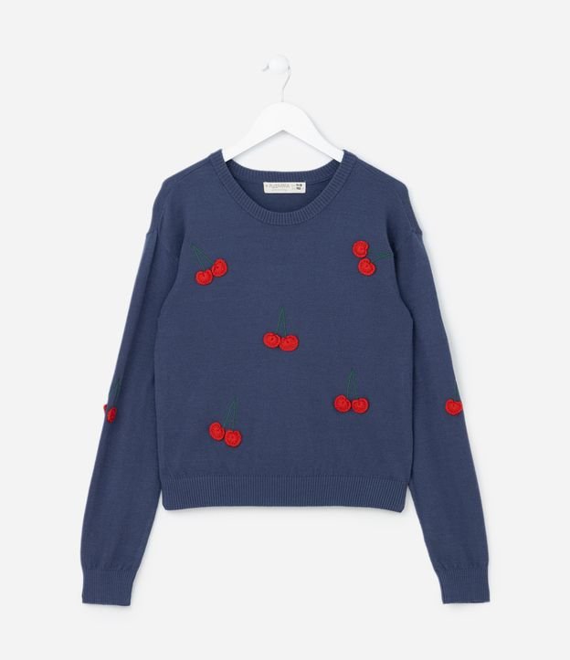 Suéter Infantil em Tricô com Bordado Cerejinhas - Tam 5 a 14 Anos