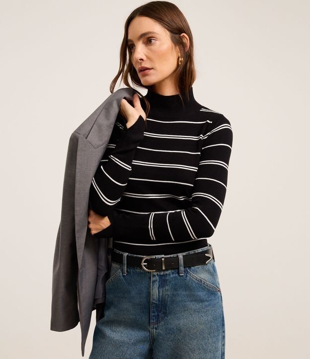 Suéter Listrado em Tricô com Gola Alta Preto