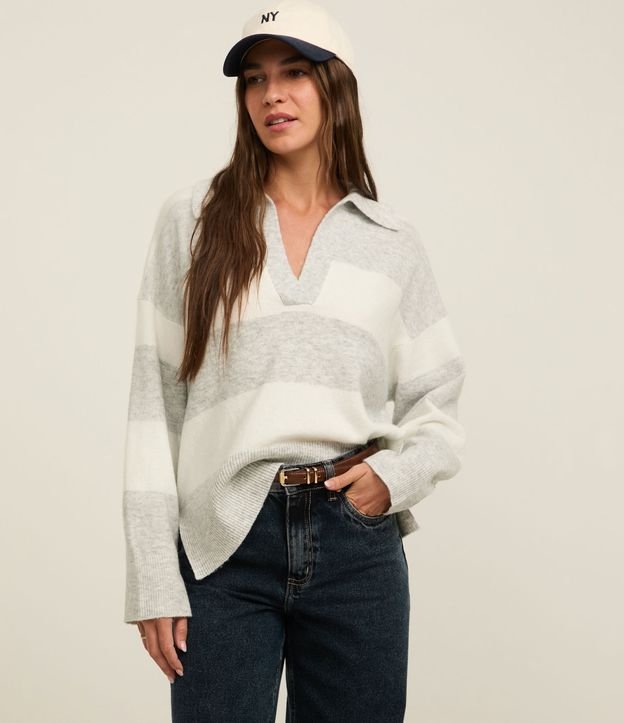 Suéter Listrado em Tricô com Gola Polo e Caimento Pesado