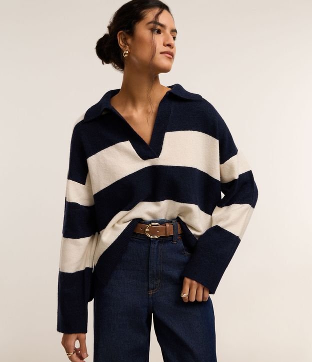 Suéter Listrado em Tricô com Gola Polo e Caimento Pesado