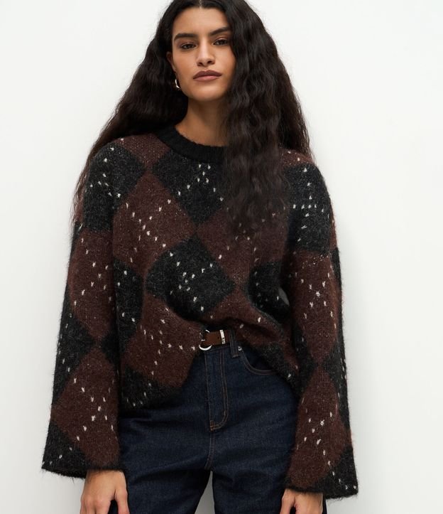 Suéter Over em Tricô com Estampa Xadrez Argyle Marrom