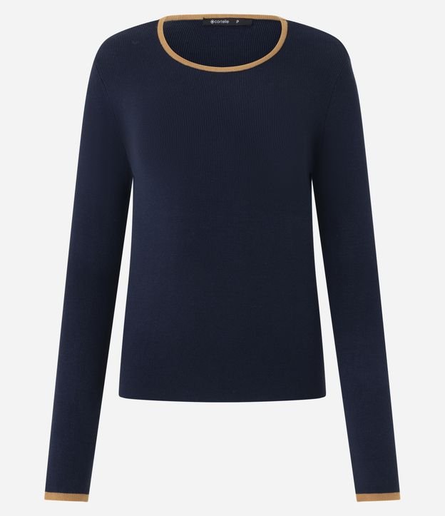 Suéter Regular em Tricô com Viés Contrastantes Azul Escuro