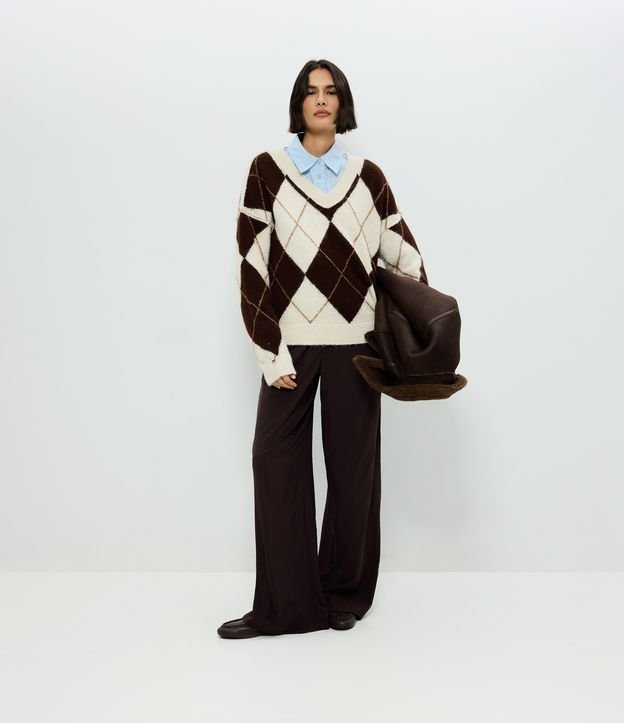 Suéter Regular em Tricô Xadrez Argyle Bege