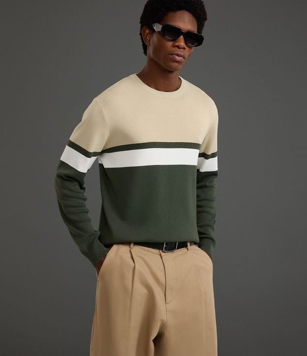 Suéter Regular em Viscose com Bloco de Cores Bege/Branco/Verde