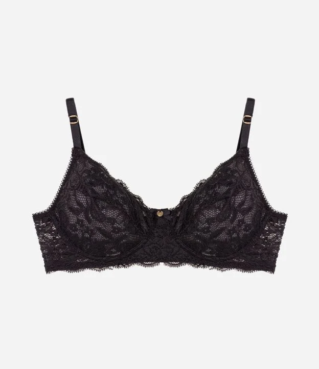 Sutiã sem bojo e com aro em renda floral, com alças reguláveis e fechamento nas costas.